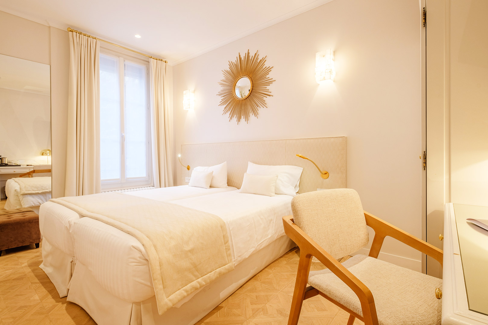 Mezcla acertada del clasicismo a la francesa y del diseño moderno, estas habitaciones ofrecen una gran cama o 2 camas gemelas a su elección y según disponibilidad